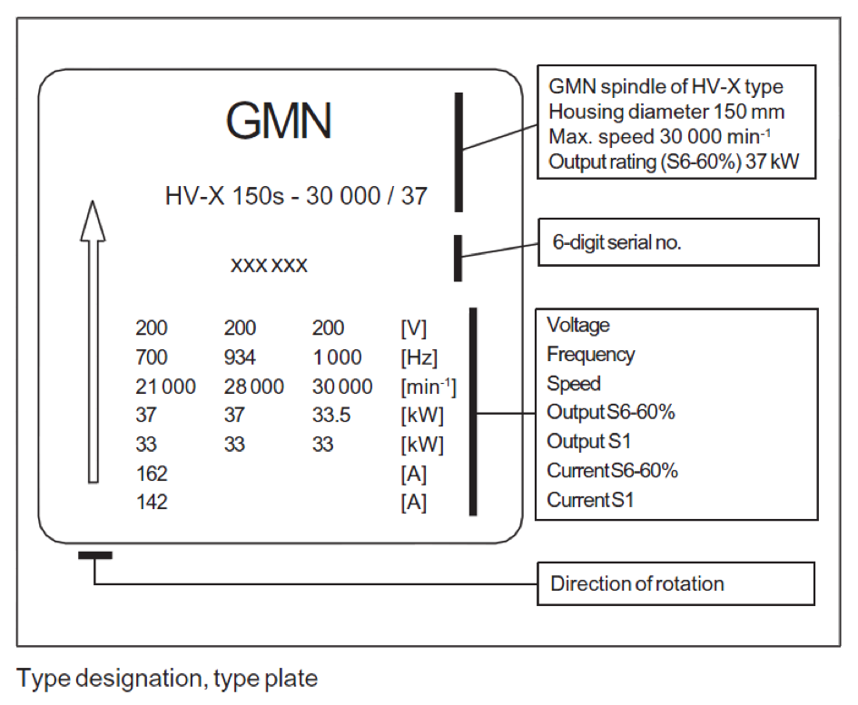 There is a nameplate and type designation engraved on each GMN high-frequency spindle on the spindle housing. The nameplate contains the electrical operating data for the spindle (see figure).